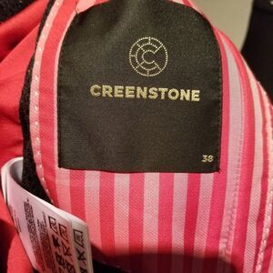 THIS BEAUTIFUL COAT IS BY CREENSTONE IT IS IN VERY GOOD PREOWNED CONDITION HAS CREENSTONE LOGOS THROUGHOUT THE HARDWARE VERY NICE HAS THREE FRONT POCKETS ONE IS A ZIPPER POCKET AND THE OTHER ARE WHERE THE SNAP BUTTONS ARE EACH POCKET HAS TWO SNAP BUTTONS. THE JACKET CAN ALSO UNZIP FROM THE BOTTOM UP. MEASURES APPROXIMATELY 21 INCHES PIT TO PIT AND 33 INCHES IN LENGTH THE SLEEVE MEASURES 19 INCHES FROM INNER ARM PIT SEAM TO WRIST. THERE IS ALSO A SMALL INNER ZIP POCKET.