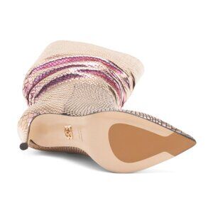 snake embossed design, slouch design, metallic finish, cushioned footbed, leather lining