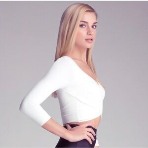 Sexy crop top with front wrap bodice and 3/4,sleeves. Partially lined. Exposed back zipper closure. Color is light pink/peach. 95% polyester and 5% spandex. Beautiful top. Perfect to wear with jeans and high heels. Offers are welcome.