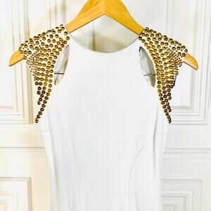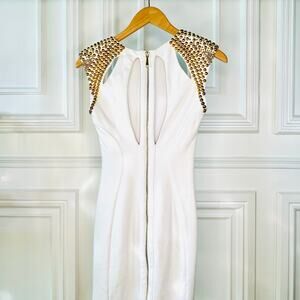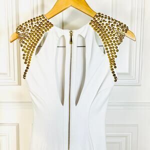 BEBE Addiction White Bodycon Mini with Gold Studded Shoulders XS