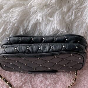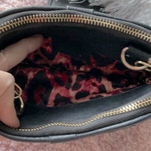 BEBE BLACK ARM BAG WITH GOLD & LEATHER REMOVABLE STRAP & RED HEART PURSE DECORE