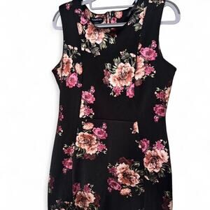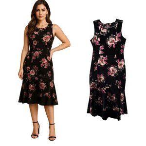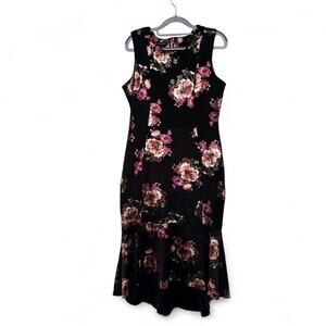 Black and pink floral midi dress with a stretchy fit