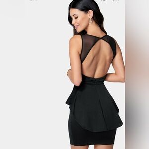 BEBE Black Peplum Bodycon Cocktail Mini Dress Open Back Sweetheart Neckline
