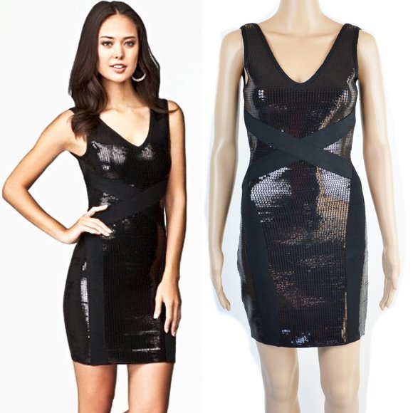 Gorgeous & sexy Bebe black all over sequin thick knit bodycon bandage stress. Double v-neckline. Back zip in. Extremely well made. Gives you that hourglass look. Perfect for a night out, date night, or party.