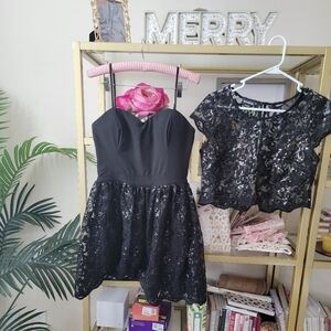 Pre-owned black sequin dress in excellent condition! Features a two-piece set with a tank top/ spaghetti stress that shimmers when you walk. Mini to mid length. Little black dress comes with matching short sleeve sequin top. Adorned with a gold zipper that zips up the back, the matching two-piece top is adorned with functional gold buttons that button up the back.