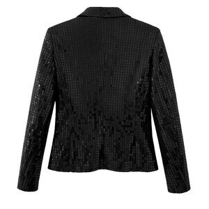 Elevate your look with this stunning BEBE Black Paillettes Sequin Blazer. Featuring a tuxedo-style silhouette, this slim-fit blazer is covered in dazzling black-on-black square sequins that shimmer with every move. The functional front zipper closure and zippered pockets add a sleek, modern touch. Double-breasted design with a notched lapel makes it perfect for formal events or chic night outs.