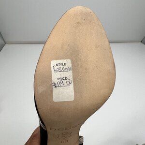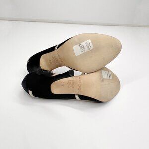 BEBE peep toe black and silver comfortable heels. Metallic silver trim. Black satin. Great for a party.