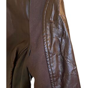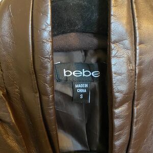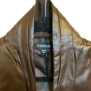 This is a pre-owned women brown faux leather crop jacket from bebe. It has a v-neckline, zip closure, and long sleeves with zipper accents. The jacket features pockets and is lined with polyester. It is a slim fit and has a short length. The jacket is suitable for party/cocktail or casual occasions and is perfect for fall and winter seasons. The style is a mix of western, motorcycle, biker, grunge, classic, and retro themes. The jacket is machine washable and was made in China.