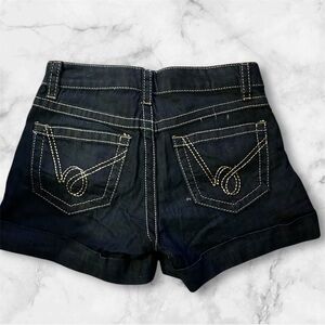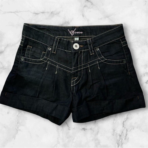 BEBE DOUBLE B STITCH LOGO DENIM PLEATED/CUFFED SHORTS SIZE 25 black 009