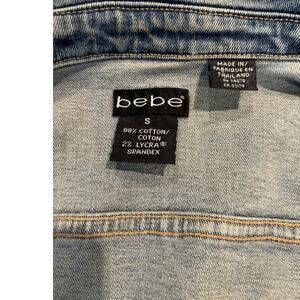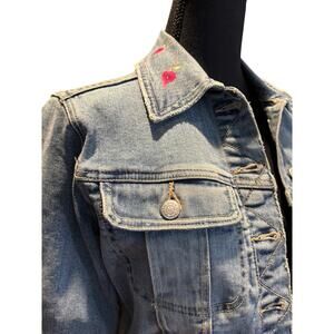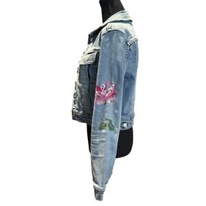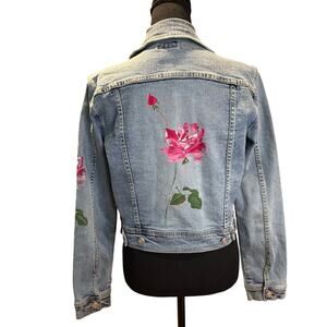 BEBE Denim Jean Jacket with Hand Painted Pink Roses Size Sm, EUC