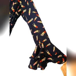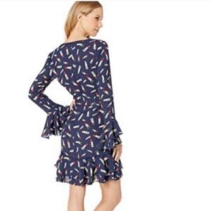BEBE Denise Full Wrap Ruffle Detail Dress, Red & Pink Lipstick Print Novelty | 2 | EUC | MSRP $149 | Ruffle Sleeve Detail | Ruffled Hemline