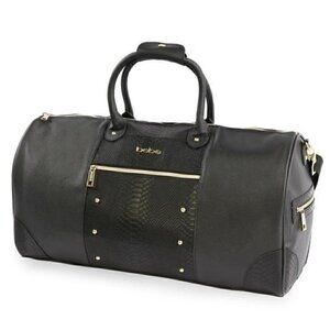 BEBE Ellisa 22" Duffle Bag Inch Weekend Travel Bag in Black/GoldExude confidence at your next destination with the Bebe Ellisa Weekender. Elegant tones of black and gold, with faux snake trim will surely leave a lasting impression and cause a splash where ever you go.