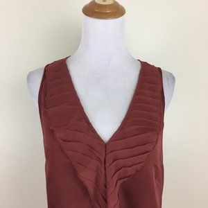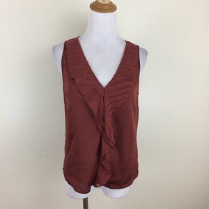BEBE Hen/Brown Satin/Sateen Chiffon Pleats Ruffle V Neck Sleeveless Top
