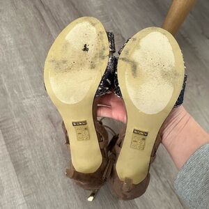 BEBE Lea Tassel Tie Faux Suede Open Toe High Heels Tan Size 8