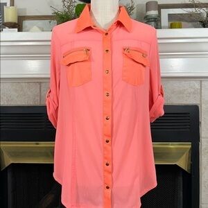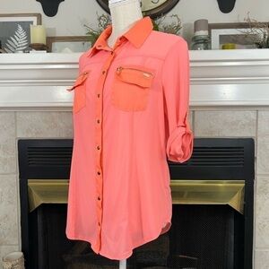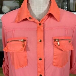 BEBE Mesh Neon Coral Snap Closure Shirt With Collar
