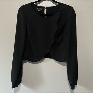BEBE- NEW Cropped Long Sleeve Blouse with Cross Over Design Size M. Small gold toned bottoms on wrists. New without tag. Very sleek material. Style with any bottoms like a skirt, trousers, or jeans.