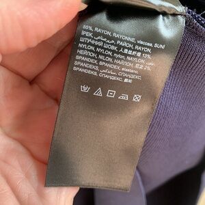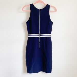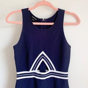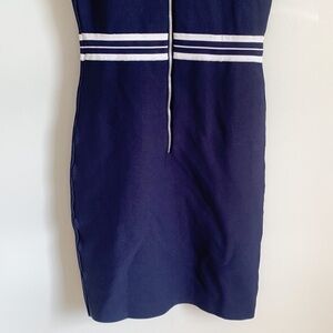 New without tags! BEBE Navy Blue White Body Con Bandage Dress. Thick, stretchy material. Front triangle cutout partial zip back with hook eye closure at the top. Unlined. Very flattering. True to size.