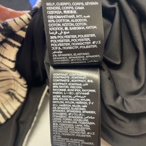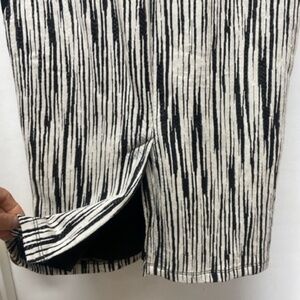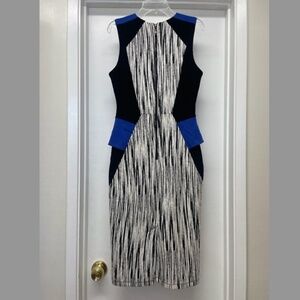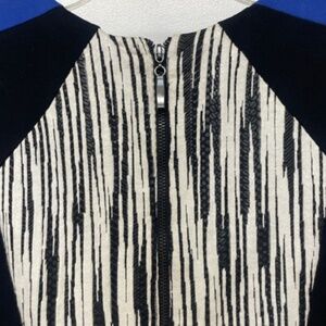 Black and off-white pattern with solid black and blue trim. Peplum style. Exposed back zipper. Back slit. Cotton, polyester, spandex blend.