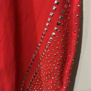 Bebe red dress with silver and gold studs. Zipper back with mesh detail. Perfect for a Christmas Holiday party!