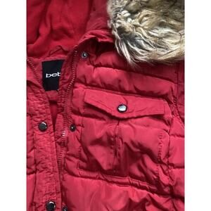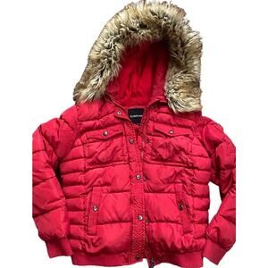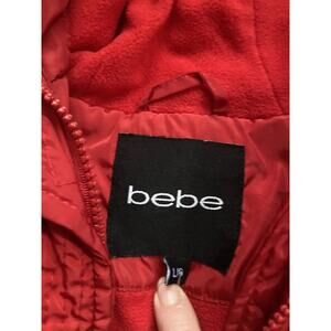 bebe Red Puffer Jacket Womens Size M Faux Fur Hood Logo Back Quilted Bomber