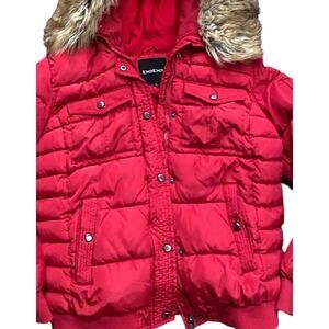BEBE Red Hooded Puffer Jacket Coat Women L Faux Fur Short Rhinestone