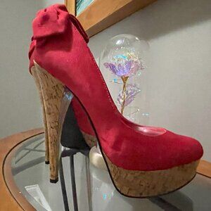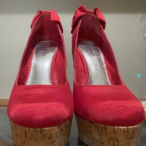 Step into statement-making style with these Bebe Kahlilia red platform heels โ size 10. Featuring a striking 6โ heel paired with a 1.25โ cork platform, they offer dramatic height with surprising comfort. The rich red hue pops against the natural cork finish, while the elegant bow detail at the back adds a flirty flourish.
