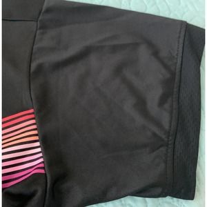 BEBE SPORT SHORT WAISTED TOP, WOMENS. XL, BLACK W/COLORFUL STRIPES ON FRONT