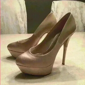BEBE Rosario Satin Heels In Beige. Comes with Box. Worn Once. There is a tiny Knick onto heel, shown in last Pic, however In Excellent Condition. Size 7