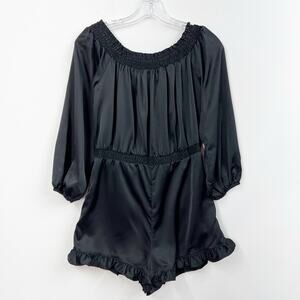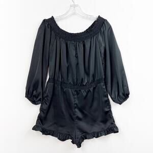 BEBE Satin Off-The Shoulder Romper Ruffled Trim Long Sleeve Shorts Black Women S