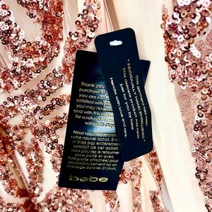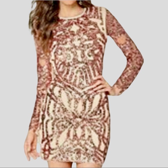 BEBE Sequin Scroll Mesh Rose Gold Bodycon Structured Dress Size M.