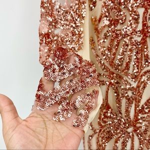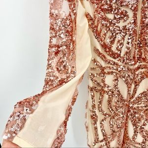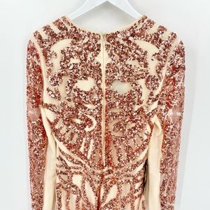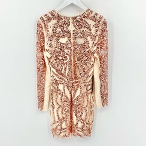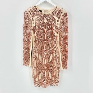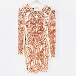 BEBE Sequin Scroll Mesh Rose Gold Bodycon Structured Dress Size M