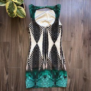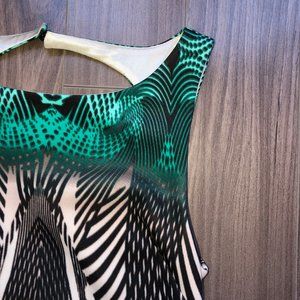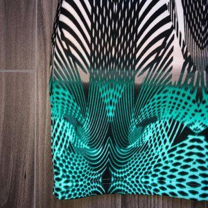 This stunning sleeveless sheath dress features a bold, symmetrical geometric and abstract print. The design combines black and cream patterns with vibrant teal and green accents near the hemline, creating a striking and dynamic look. The tailored silhouette and round neckline give the dress a sleek and modern aesthetic, perfect for a figure-flattering fit. This dress is fully lined.