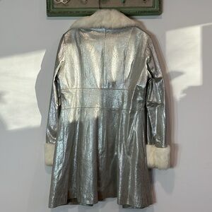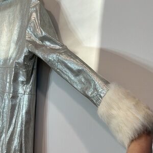 Bright bold and brilliant silver leather trench with white rabbit fur accent cuff and collar