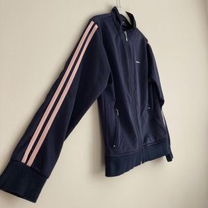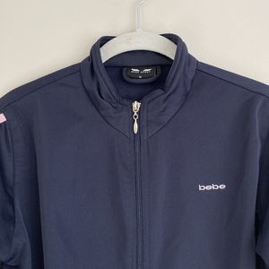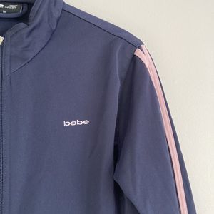 BEBE Sport Vintage Y2k Track Jacket Blue Pink Early 90s 00s Size Medium. Bebe Sport women's vintage track jacket. 90's Y2K. Navy base with pink stripes on sleeves. Full zip. Zippered front pockets. Polyester fabric. Size medium. Measured laying flat: measures 19" from armpit to armpit. Measures 29.25" from mid tag to end of sleeve. Measures 22" long from top of tag to hem of jacket. *** Some fabric wear on hemline and wrists.