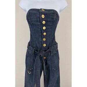 BEBE Strapless Denim Jumpsuit Snap Front Tie Belt Detail Bell Bottom Retro Sz 24