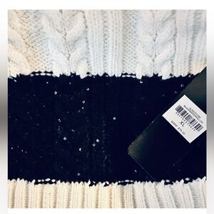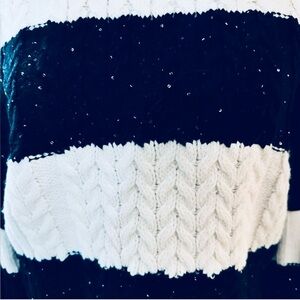 Stay cozy and stylish in this Bebe striped cable knit sweater! Featuring a classic black-and-white stripe design, this sweater is elevated with delicate sequin embellishments for a subtle shimmer. The relaxed fit and cropped cut make it perfect for layering over your favorite jeans or skirts!