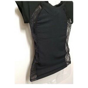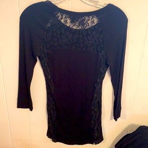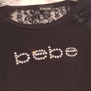 Sexy bebe top With a lace back and lace sides. Lace is floral And see-through. Bebe in rhinestones on the front. Top is long and fitted and has three-quarter length sleeves.