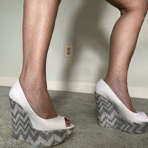 White, gray, glitter, wedge, open toe, summer, party, sexy, zigzag heel, platform1.5 inch heightat front and and 5 inch at heel.
