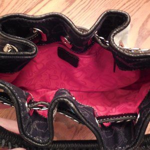 This beautiful bag with a patchwork of various materials has never been used and looks brand new. The studs and hardware look great with a dress or jeans. The red liner with magnetic closure shows no signs of wear. The strap fits comfortably over the shoulder.