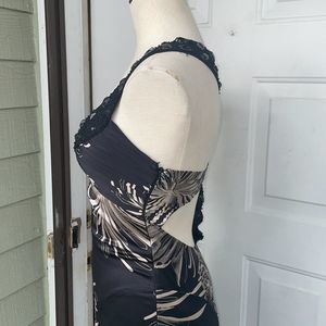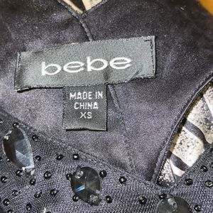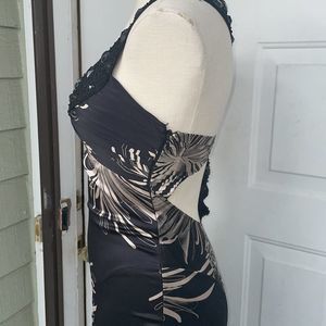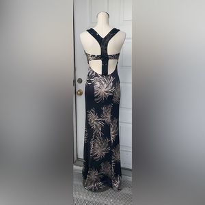 BEBE Y2K Stretch Silk Cocktail Formal Maxi Dress Gown size XS Black/Pearl Gray