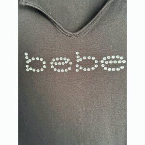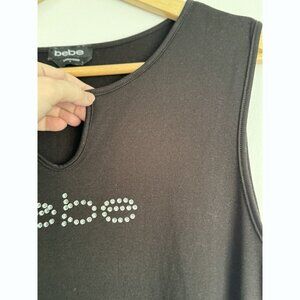 BEBE Y2K Crystal Logo Ruched Sleeveless Midi Dress Size Large Black Stretch 90s