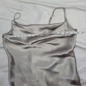 Cowl neck taupe satin spaghetti strap bias cut midi slip dress with lettuce hem by Bebe. Small faint spots shown in photos, not super noticeable. Made in the USA. Trending style! Polyester.
