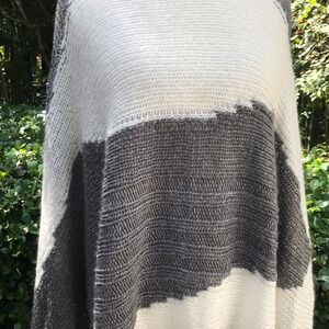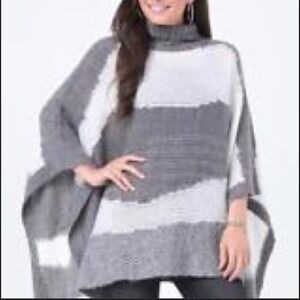 BEBE GREY STRIPED ABSTRACT PONCHO. Great condition. 83% acrylic, 17% wool; content 2: 57% acrylic, 29% nylon, 8% mohair. One size. Grey and white abstract stripe.