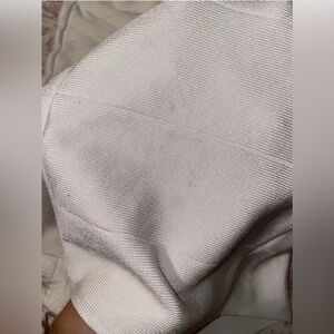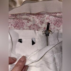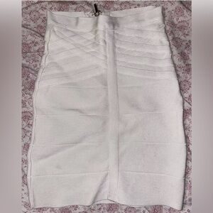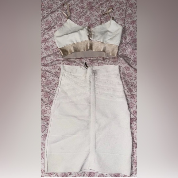 BEBE 2 pc skirt and top set! Size XS. Skirt is high waist, bandage, stretchy, silver exposed zipper. Top is like a bra top. Pullover with some beige. Skirt has some smudges but I haven’t tried to clean it. Hard to see but I took photos.