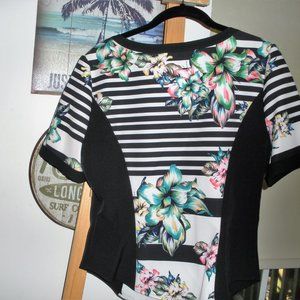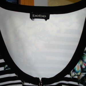 BEBE light weight jacket, can be worn as a top. Zip front metal zipper in good condition. Item is good hardly worn condition. Flowered as shown. The fit is on the form fitting side. the bottom hem is slightly curved, fits slightly below the waist. size is M/L More on the M side