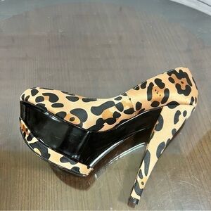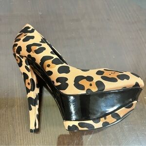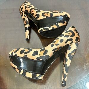 BEBE super hot & sexy sky high heels platform pump Patent & Leopard print 6 EUC
