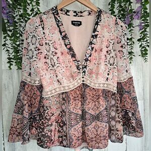 Beautiful flowy sleeves with lace details around the arms and waist. Hidden side zipper. V neck design with silver tone buttons. I love this shirt it just doesnt fit me. I am so sad to part with her but I hate just having it hanging in my closet.