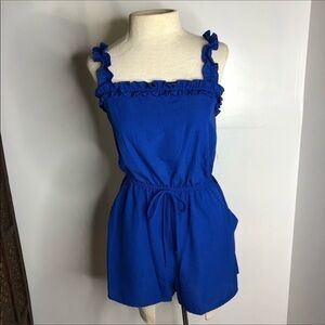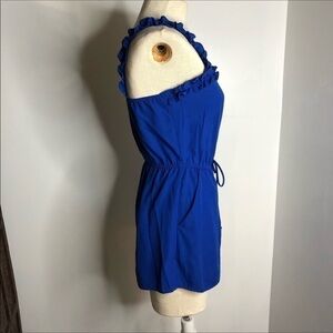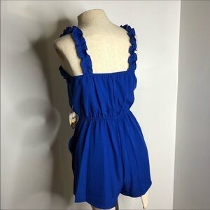 Cobalt blue romper in cool polyester with elastic waist, pockets on either side ruffled elastic shoulder straps ,brand new with tags size sx ,total length from top of shoulder to bottom of him 29 “ from armpit to armpit 15”waist line is elastic and it is from 11”inches to 16” with elastic stretch