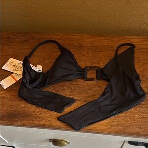 Stylish black bikini top by BECCA. Can be worn multiple ways as shown in model pictures. Ribbed detail and removable padding.
