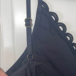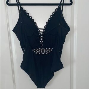 Elegant black one piece with scallop lace details. Features a deep V-neck and intricate lace band.